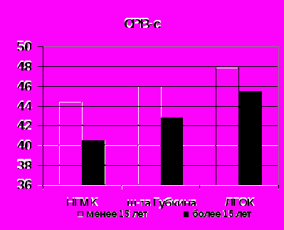 | * - разница достоверна со стажевой группой > 15 лет в пределах одного предприятия (р<0,001-0,05); ** - разница достоверна с соответствующей стажевой группой ЛГОК (р<0,001-0,05); • - разница достоверна с соответствующей стажевой группой КМА (р<0,05) | ||||||
