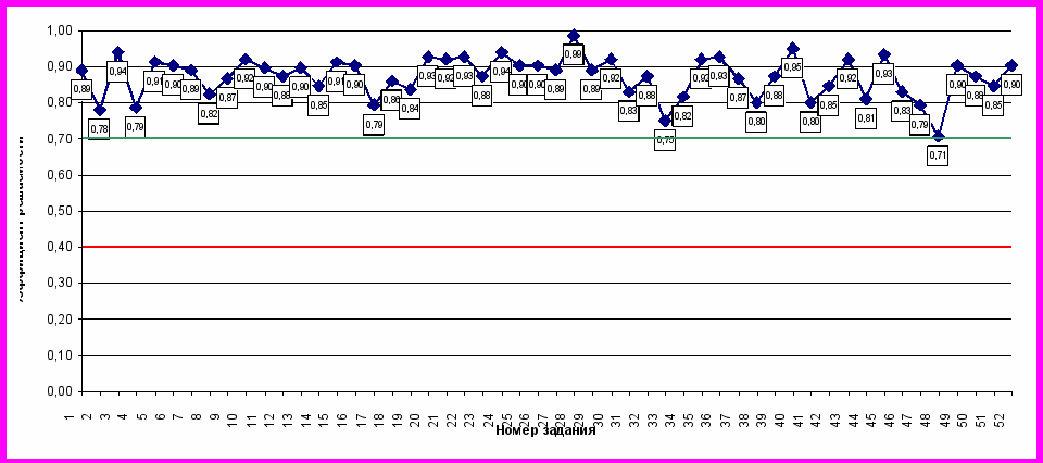 Значения коэффициентов решаемости для заданий рассчитываются как соотношение числа студентов, выполнивших задание, к общему числу участников, которым предлагалось данное задание. При анализе результатов педагогических измерений по карте коэффициентов решаемости можно придерживаться следующей классификации уровней трудности заданий для данной группы студентов: легкие задания – коэффициент решаемости от 0,7 до 1,0; задания средней трудности – коэффициент решаемости от 0,4 до 0,7; задания повышенной трудности – коэффициент решаемости менее 0,4. Для группы студентов, освоивших дисциплину на уровне требований ГОС, все задания должны иметь коэффициент решаемости не ниже 0,7.