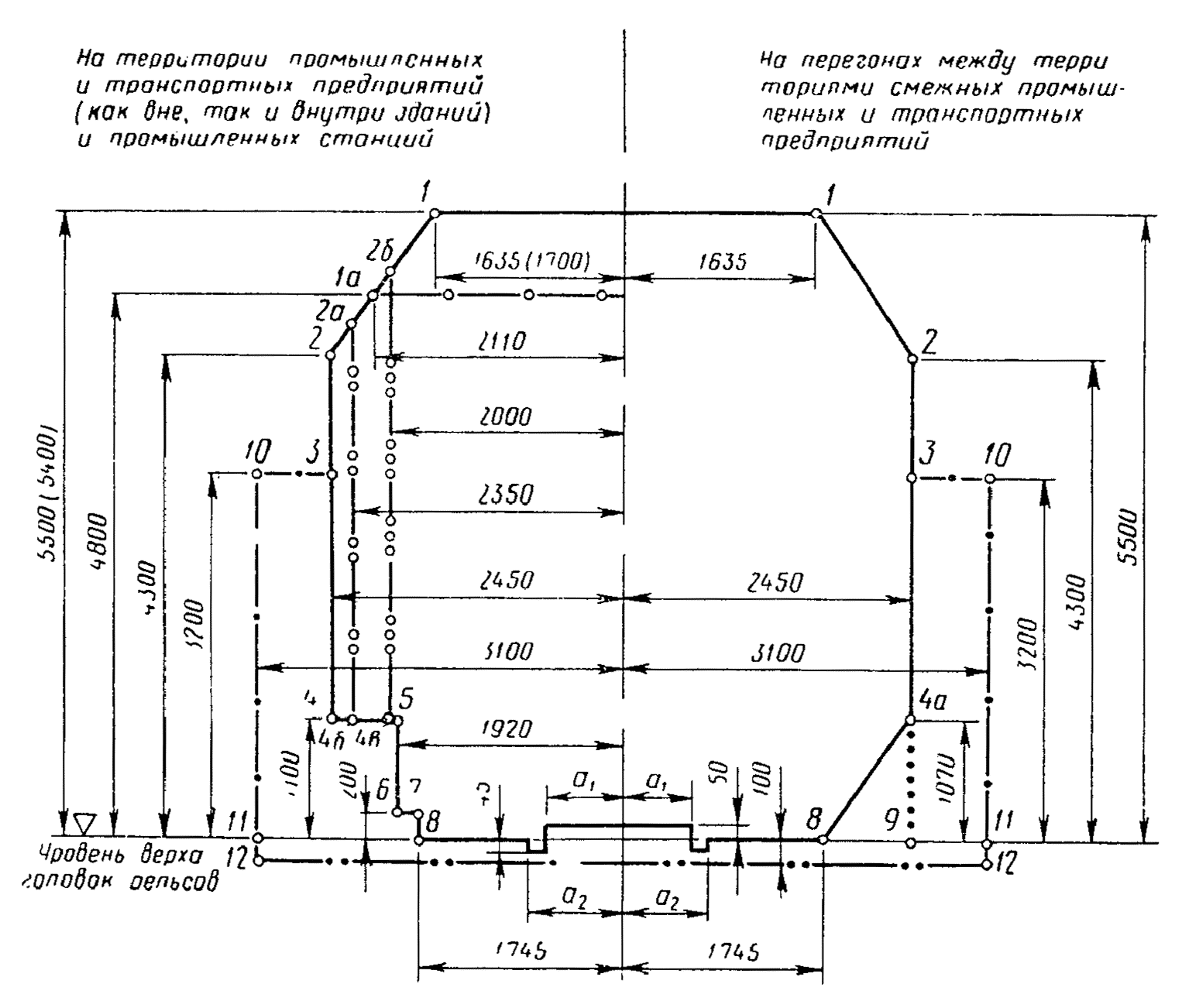 2. Размеры от оси пути до точек 1, 1a и от уровня верха головок рельсов до линии 1 - 1 указаны для неэлектрифицируемых путей, при этом в скобках приведены размеры, допускаемые внутри зданий.