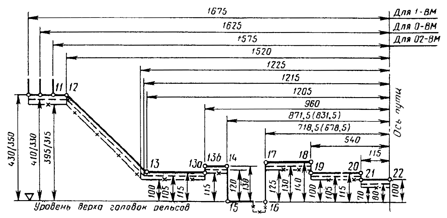 1-ВМ (0-Т) - для подвижного состава, допускаемого к обращению как по всей сети железных дорог Союза ССР колеи 1520 (1524) мм, так и по магистральным и ряду других линий железных дорог - членов Организации сотрудничества железных дорог (ОСЖД) колеи 1435 мм, используемых для международных сообщений (черт. 12, 15);