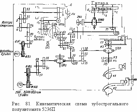 Кинематическая схема полуавтомата (рис. 81) состоит из следующих основных кинематических цепей: главного движения, подачи, деления и обката.