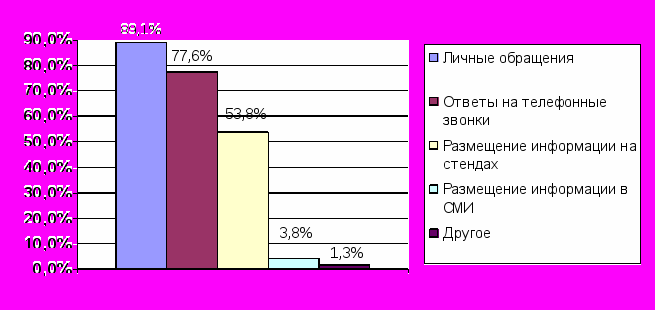 Наиболее популярным методом информирования граждан, по словам респондентов, является предоставление информации при личном обращении граждан (139 человек 89,1 % опрошенных). Также наиболее популярными методами информирования граждан, используемыми в поселениях, являются информирование граждан при ответе на телефонные звонки (121 человек или 77,6 % опрошенных), и размещение информации на информационном стенде (84 человека или 53,8 % опрошенных). 6 человек (3,8 % респондентов) отметили такой способ информирования граждан, как размещение информации в средствах массовой информации.