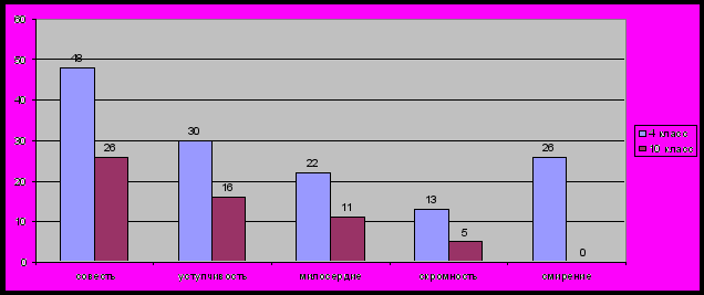 В группу отрицательных качеств, выделенных десятиклассниками, попали и такие качества, как смирение – 37%, скромность - 21% , уступчивость – 16%, милосердие – 10%. В то время как в 4 классе только 8% отнесли скромность к отрицательным качествам, а смирение – 13%. Все остальные качества десятилетними респондентами были распределены правильно.