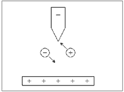 При положительной ионизации молекулы воздуха отдают электроны иглам (рис. 1). У игл и ниже образуются слои с преобладанием молекул, у которых недостает одного или двух электронов, т.е. слои положительных аэроионов.
