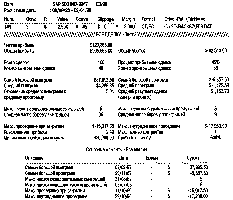 А вот кое-что действительно удивительное... табличные данные на рисунке 15.1, демонстрирующие $141,792.50 прибыли от торговли S&P 500, которые получены без единого использования цены S&P! Сигналы на покупку отдавались методом, который предписывал, что когда возникают условия «А» в данных «А», тогда и только тогда следует открывать длинные позиции для «В» — S&P. Учитывая среднюю прибыль на сделку в размере $1,750, которая в 2.20 раза больше, чем средний убыток, и проседание менее 13 процентов от суммы заработанных денег, я думаю, можно уверенно заключить, что данные «А» хорошо прогнозируют данные «В».
