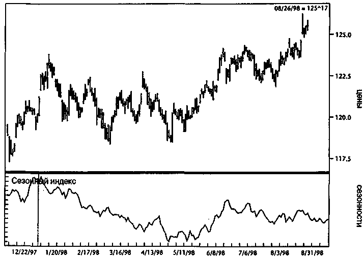 Чтобы лучше понять, как цены обычно перемещаются в течение каждого месяца года, на рисунке 6.4 показан дневной график, отражающий изменения цен в каждый TDM. Напоминаю, это общие контуры того, как цена вела себя в прошлом. Подобно дорожным картам, цена в этом году и в этом месяце может соответствовать, а может и не соответствовать данной фигуре. Обычно, однако, эти ценовые конфигурации соблюдаются. Рисунок 6.4 представляет казначейские бонды в течение 1998 г.: ниже области ценовой активности проходит линия, показывающая дневное движение на протяжении каждого месяца. Никто не должен ожидать, что цена будет в точности следовать за этим индексом, но в общем она следует за подъемами и спадами. Показанный индекс создан на основе исторических данных и продлен в 1998 год. Как вы можете видеть, пик января возник как по расписанию, как и падение в мае, а потом подъем в июне и откат в конце июля.