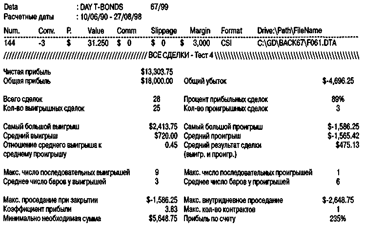 Например, при проверке этой фигуры с 1986 г. по 1998 г. для S&P 500 зафиксировано 25 случаев его проявления во вторник с последующим сигналом на продажу в среду. Из них 19 оказались выигрышными, принеся $21,487. На рынке бондов эта же фигура указала на 28 сделок в четверг с продажей в пятницу, сделав $13,303, что бросает вызов профессорам случайного блуждания и заставляет их задуматься над его 89-процентной точностью. Тест по бондам проводился на данных с 1989 г. по август 1998 г. Для бондов использовался стоп $1,500, а для S&P 500 — $2,000.