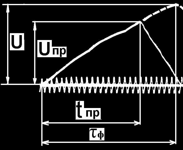 а – прямоугольный импульс с наносекундным фронтом; б – косоугольный импульс с микросекундным фронтом; U – максимальная амплитуда импульса; Uпр – пробивное напряжение породы; τф – длительность фронта импульса; tпр – время до пробоя; fгр – градуировочная частота, fгр = 100 МГц