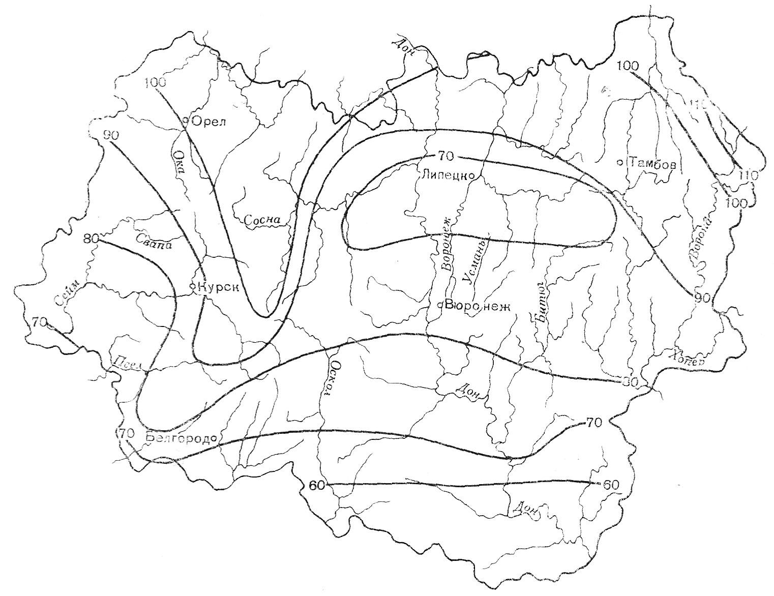 Рис. 3. Схематическая карта средних максимальных за зиму запасов воды (мм) в снежном покрове Центрального Черноземья