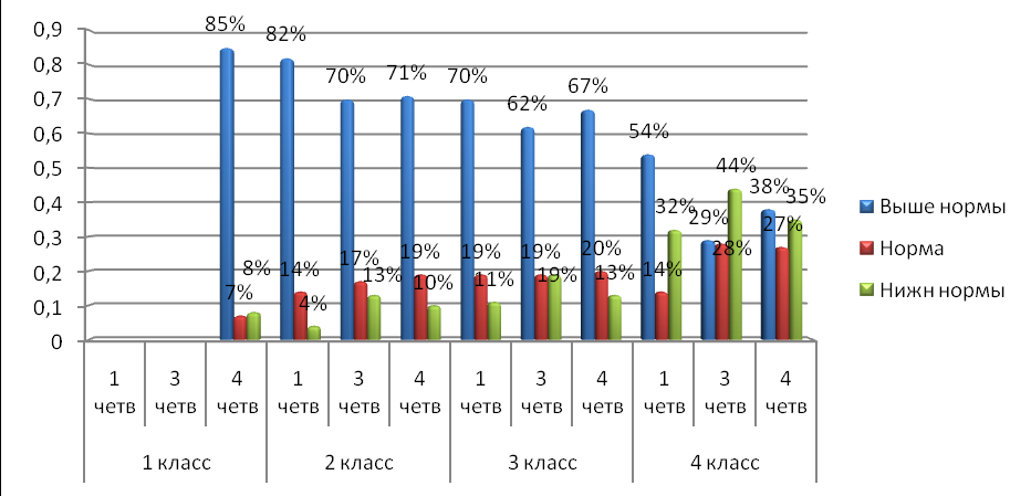 Данные, представленные на диаграмме 4, позволяют утверждать о том, что показатель сформированности беглости чтения «выше нормы» на параллели 2-ых и 3-их классов несколько снизился к концу 3 четверти и оставался стабилен к концу учебного года во 2-ых классах и несколько возрос (на 5%) в 3-их классах.