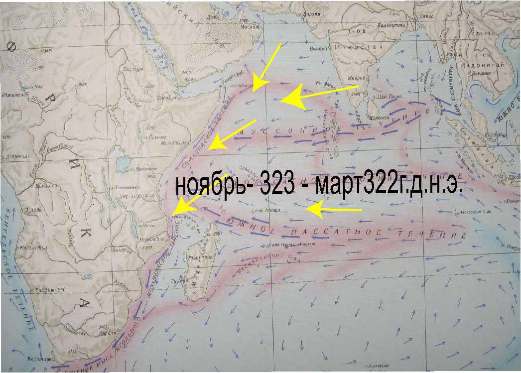 В 322 году днэ эскадры обогнув мысы Игольный и Доброй Надежды двинулись на север- к экватору.