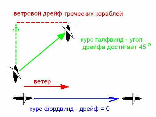 Против ветра флот совсем не мог двигаться на парусах. Если же корабли шли к ветру бортом перпендикулярно (курс «галфвинд»), то двигаться они в принципе могли, однако их дрейф по ветру был весьма силен – он достигает 40-45 градусов от курса корабля, т.е. сколько миль корабль проходит вперед, на столько же миль его сносит вбок от его курса . Кроме этого, на курсе Галфвинд, корабли при свежем ветре могли завалиться на борт из-за потери остойчивости – ведь они не несли достаточно балласта и, как следствие, имели слишком большую метацентрическую высоту. Я полагаю, что греки практически почти и не пользовались курсом и ветром галфвинд.
