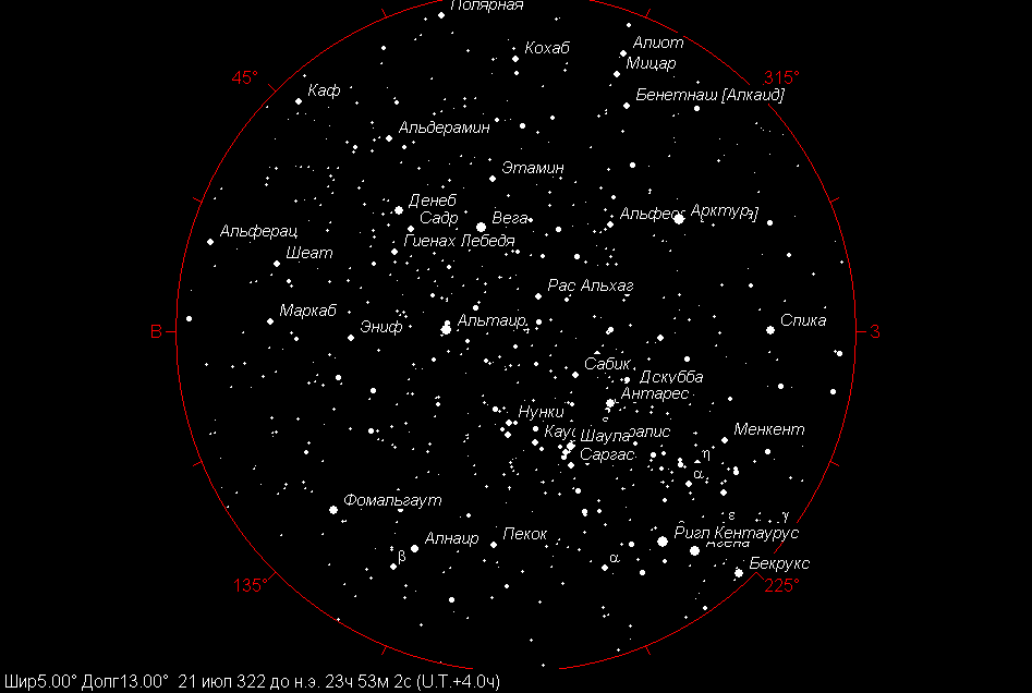 - .При помощи компьютерной астрономической программы «Старкалк» вы можете наблюдать картину звездного неба любого заданного периода времени. На рисунке -ночное небо в 322 г. до.н.э. например- 21 июля в час ночи, для наблюдателей в тропике Рака – вблизи вычисленных нами ловушек №№ 3,4,5. Рис. 19