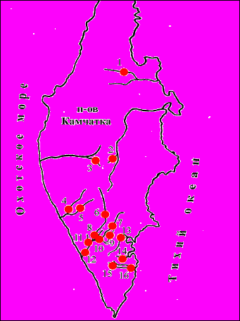Рис. 1. Схема района работ: 1 - бассейн р. Левая Озерная, 2 - бассейн р. Камчатка, 3 – бассейн р. Ича, 4-5 – бассейн р. Кихчик, 6-12 – бассейн р. Большая, 13 – бассейн р. Паратунка, 14 – бассейн р. Вилюча, 5-16 – бассейн р. Фальшивая