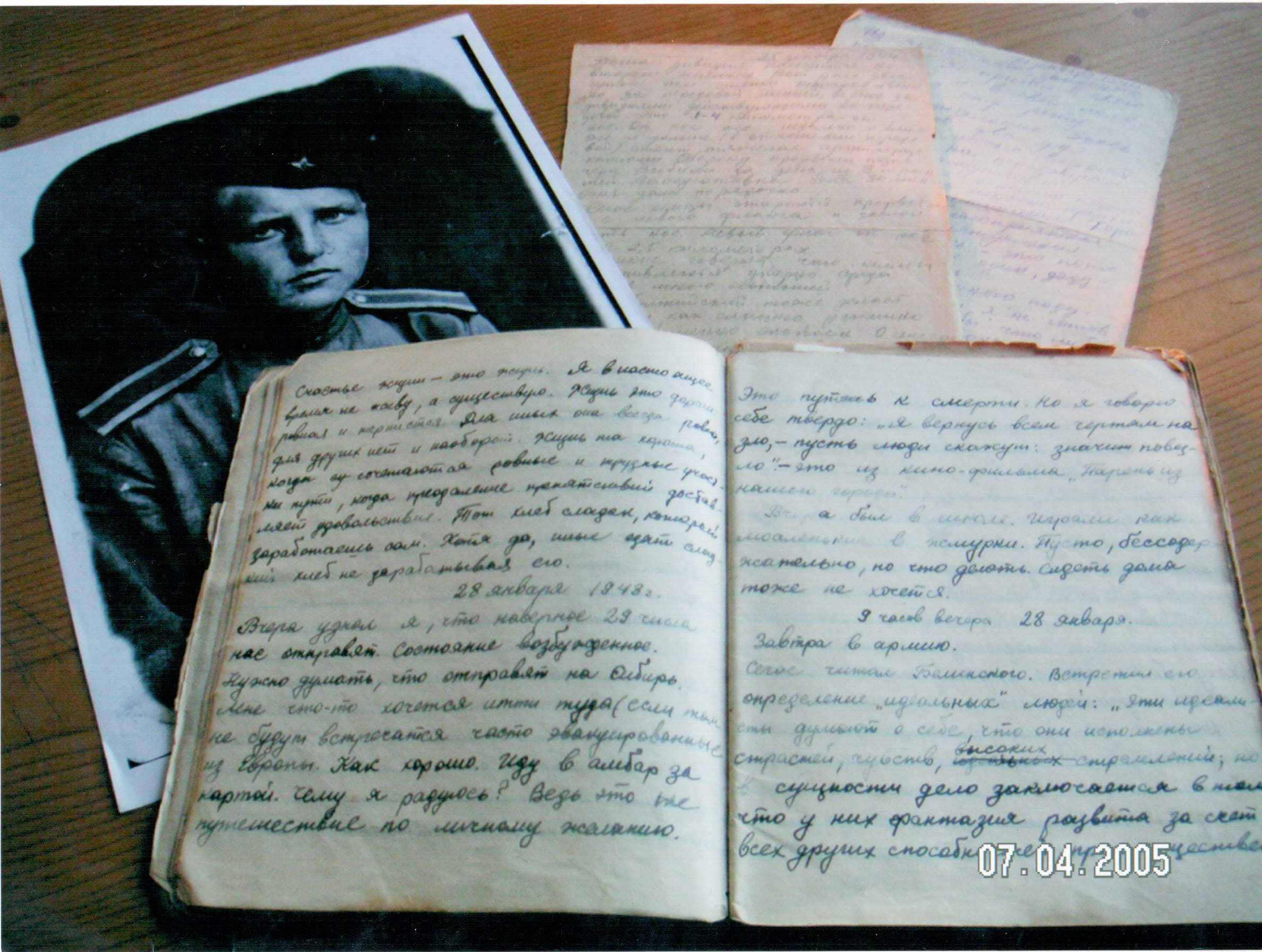 Согласитесь, очень смелый и очень ясный взгляд на существующие порядки! Когда-то в начале XIX века русский мыслитель П.Я. Чаадаев, смеявшийся над «блаженным патриотизмом», заявил, что не желает любить Родину с закрытыми глазами, склонённой головой и запертыми устами. Вряд ли юноша, в судьбу которого ворвались «сороковые, роковые, военные и фронтовые» годы уже XX века, мог быть знаком с трудами Чаадаева, но суждения, высказанные на страницах дневника, явно перекликаются с утверждением философа: «Прекрасная вещь – любовь к Отечеству, но есть ещё нечто более прекрасное – это любовь к истине».
