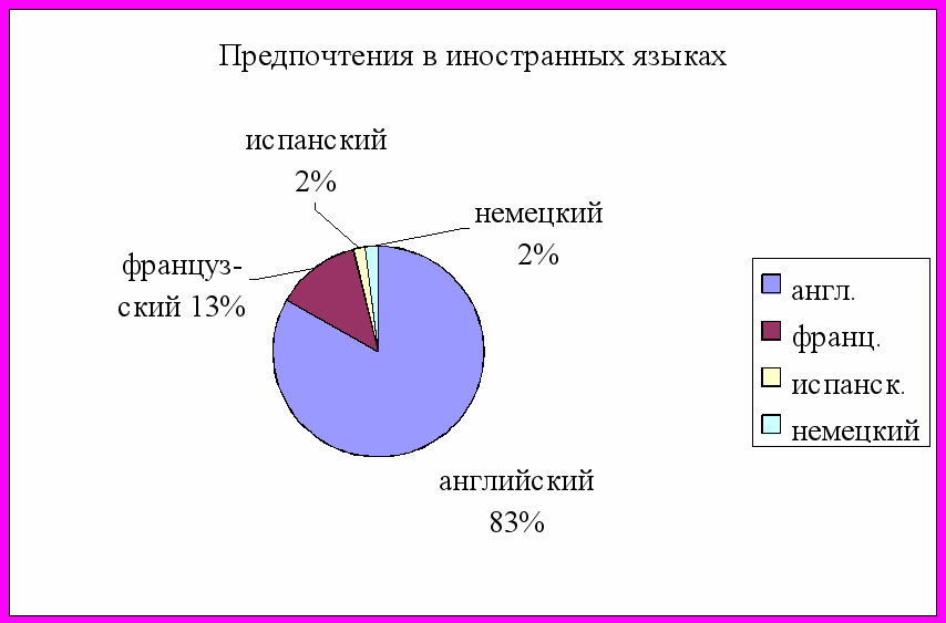 Более 80% опрошенных ответили, что английский, так как он интернациональный язык; 13%-французский, 2%-испанский и 2%-немецкий.