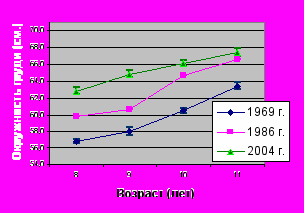 Сравнительный анализ динамики (1969, 1986, 2004 г.) физического развития младших школьников тувинской национальности (рис.1) позволил сделать вывод о продолжающемся процессе акселерации, хотя у девочек в 11 лет наблюдается отрицательная тенденция в показателях веса. Вероятно, это является следствием «психоэмоционального воздействия средств массовой информации об идеальном и модном телосложении» [Година Е З., 2004].