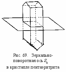 юбая прямая является осью симметрии 1-го порядка C1. Наличие в теле только таких элементов симметрии говорит об отсутствии симметрии. Зеркально-поворотные оси соответствуют повороту около оси и отражению в перпендикулярной плоскости. В осях четного порядка S2n, как видно на примере кристалла пентаэритрита (рис. 69), имеющего ось S4, нет ни отдельно существующей поворотной оси C4 ни перпендикулярной к ней плоскости симметрии. Поворотная ось симметрии вырождается в ось Cn с вдвое пониженной кратностью. Нечетные зеркально-поворотные оси распадаются на поворотную ось и перпендикулярную к ней плоскость S2n+1 = C2n+1+ m. Поэтому как самостоятельные элементы симметрии рассматриваются только четные зеркально-поворотные оси S2n. Группа инверсионных осей эквивалентна группе зеркально-поворотных осей: Si = 1 = i; S4 = 4; S4= 3.