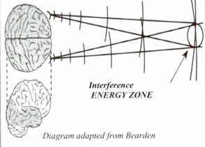 Рисунок 4.4 Мозг как скалярный интерферометр. Согласно Бирдену, мозг – излучатель и приемник скалярных волн. Два полушария объединяют свои функции, чтобы образовать скалярный интерферометр; они могут создавать интерференционные паттерны из интерференционных лучей, которые фокусируют энергию или электромагнитные волны на расстоянии. Согласно Бирдену, скалярная технология использует принципы интерферометра, чтобы передавать информацию и энергию в пространство посредством “гиперканалов”. В трехмерном пространстве мы не воспринимаем гиперканалы. Но они существуют. Эффекты скалярных интерференционных лучей материализуются и становятся видимыми в трехмерном пространстве. Совершенствование мозга открывает “гиперканалы”, и они действительно постоянно открыты. Существуют механизмы связи “гиперфункций “ мозга. Когда “целители” передают энергию, более точно этот процесс можно описать как гиперченнелинг! (См. Приложения к главе, № 24)