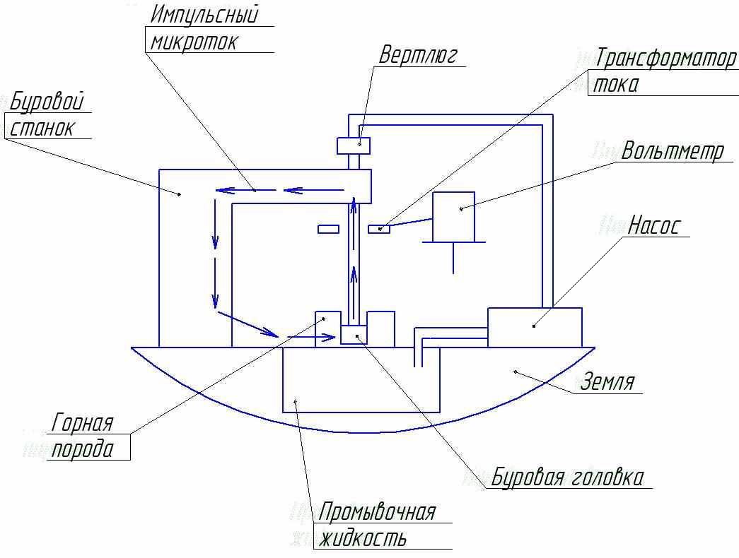 Если рассуждать о сути явления возникновения электрических токов при механическом разрушении горных пород, то она проявляется в следующем. При вдавливании индентора (зубец долота) в горную породу в ней возникают под действием критических напряжений трещины нормального отрыва, на плоскостях которых образуются электрические заряды с некоторой плотностью. В результате возникают следующие процессы: эмиссия быстрых электронов и электромагнитная эмиссия (импульсное электромагнитное поле), которые несут информацию о величине механических потерь энергии. После возникновения импульсной и постоянной составляющей токи с границы раздела «долото – горная порода» начинают свое движение к поверхности, где и снимаются с помощью замкнутого контура и, проходя через усилитель, передаются для обработки на компьютер. Замкнутый контур представляет собой электрическую схему где один конец замыкается на основание буровой или обсадную колонну, а второй на элемент оборудования, имеющий связь с забоем (бурильная колонна, сливная воронка). В результате информационного поиска и изучения процессов, возникающих на забое, были сделаны выводы о том, что электромагнитная эмиссия в данном случае представлена термоэлектронной эмиссией (эмиссия электронов с поверхности раскаленного тела – на контакте зубца долота и горной породы температуры достигают нескольких тысяч градусов) и экзоэлектронной эмиссией (эмиссия электронов при механическом разрушении тела). Кроме того, было обозначено, что свой вклад в результат эксперимента вносит: возникновение и разрушение двойного электрического слоя на границе раздела «долото - горная порода», непосредственно связанный с контактной разностью потенциалов на границе раздела, а также электрохимические свойства жидкости.