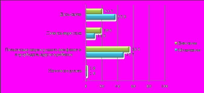 При сравнении данных с результатами опроса 2009 года, можем отметить некоторое смещение в отношении поведения мальчиков — несколько возросло количество людей, которые полагают, что мальчикам необходимо обратиться за помощью к взрослым, то есть использовать «мирный» способ решения конфликтов.