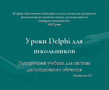 Результатом разработок стал учебник, призванный помочь учителям информатики в преподавании основ программирования в визуальной объектно-ориентированной среде Delphi7.
