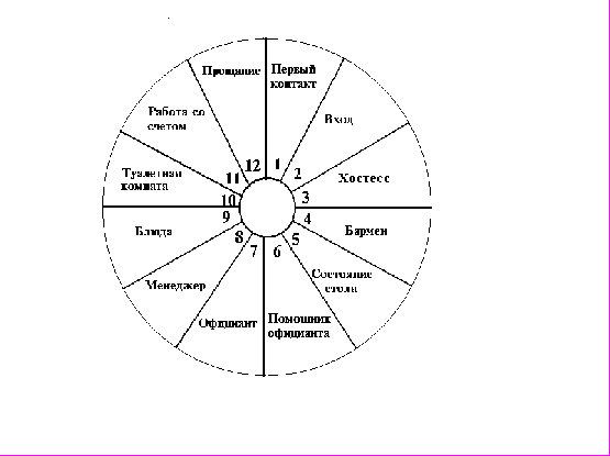 Если в качестве примера взять ресторан полного обслуживания, можно разбить “моменты соприкосновения” с гостем, возникающие у каждого сотрудника, на 12 определенных секторов. Зная цели и задачи каждого сектора, Вы знаете, чем и как управлять и кто несет ответственность за выполнение заданий и обеспечение качественного сервиса. Если объединить и расположить все эти сектора в хронологическом порядке, они образуют так называемый “Цикл Обслуживания”, применяемый в ресторанном бизнесе.