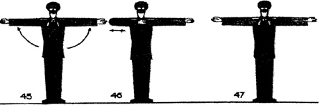 Вытянуть руки в стороны ладонями вперед (рис. 45), затем согнуть правую руку перед грудью ладонью внутрь, запястье у средней линии корпуса (рис. 46), после чего выпрямить правую руку в сторону (рис. 47).