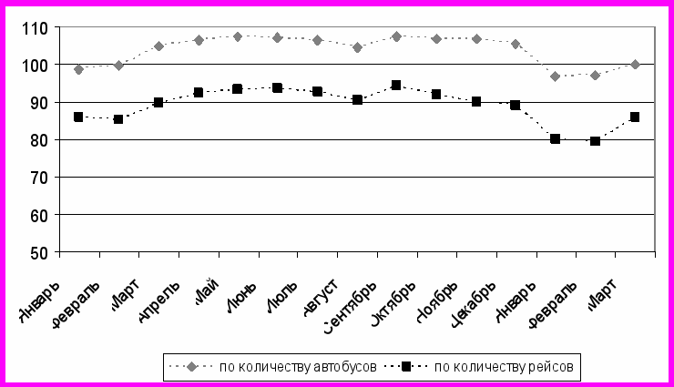 изменение соотношения выполнения сменно-суточного плана по выпуску автобусов и по числу выполненных рейсов имеет значительные колебания и отклонения у коммерческих предприятий, что говорит в различных случаях о сокращении перевозчиками числа выполненных рейсов в праздничные дни (январь, май), летние месяцы (июнь-август);