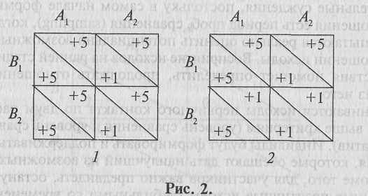В первой матрице (рис. 3, 1), если А выберет Ах, то он тем самым весьма повлияет на исход для В— для него уже исключена возможность исхода +4, он может иметь либо +2, либо —1. В этом и состоит поведенческий контроль, а лучше сказать, влияние А на В. Аналогично и В может влиять на исходы для А: если В выбирает В2, то для А исключается исход +4, и он может получить либо +2, либо — 1. Чтобы более конкретно представить себе данную ситуацию, обычно приведенная матрица получает следующую условную содержательную интерпретацию. Муж (А) и жена (В) хотели бы вместе провести вечер, причем муж предпочитает, чтобы они вместе пошли в кино (Av BJ, а жена — чтобы они вместе пошли на концерт (А2, В2). Пойти порознь для них хуже, чем идти на нежелаемое, но вдвоем. Если оба отправляются в кино, то для А это хорошо (+4): он любит кино, да к тому же они идут вместе. Для В это сулит меньший исход (+2): она не любит кино, но все-таки они идут туда вдвоем.Если А идет в кино, а В— на концерт, это испортит настроение обоим (А = — 1, В = -1) — они не выносят разлуки. Если оба посещают концерт, это благоприятствует В (+4): она любит концерты, к тому же они будут вдвоем. Для А этот вариант несколько хуже (+2): ему не нравятся концерты, разве что они будут здесь оба. Если А — на концерте, а В — в кино, то они опять оказываются порознь, и это для них плохо (А = — I, В = — 1).