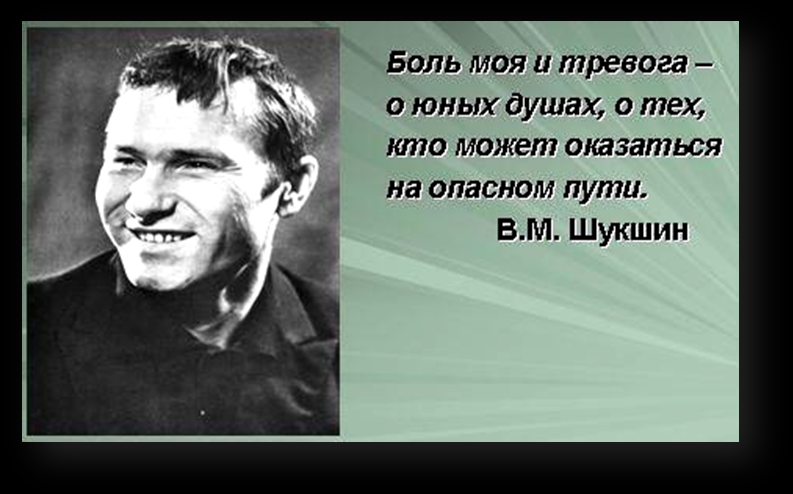 «… Василий Шукшин вспыхнул на горизонте культуры ослепительно чистой, яркой звездой, прямо – таки сказочной россыпью дарований. Писатель, романист и драматург, режиссер больших народных полотен, удивительный, неповторимый артист, умеющий в самой обыденной интонации сказать такую пронзительную, такую необходимую правду о простом человеке, что миллионы сердец… замирали в едином порыве. И в том - то и дело, вроде бы разносторонние его дарования были объединены одним порывом – познать душу народа, слиться с ней в неразрывном единстве, когда на голос художника, вдруг всколыхнувшись, отзовется самая глубь…»