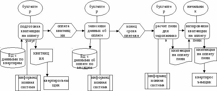 Например, для системы «Оплата коммунальных услуг» такими функциями могут быть: формирование квитанции на оплату услуг за месяц по квартире, определение задолжников по оплате, формирование списка квартиросъемщиков, не имеющих горячего водоотведения, и т.д. Все эти функции замыкаются на бухгалтера ЖЭУ, а визирование штрафных санкций к задолжникам – функция начальника ЖЭУ.