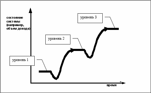 - Изменения происходят в виде перехода с уровня на уровень, ступенчато: относительно устойчивый уровень – затем период роста либо падения – и затем снова относительно устойчивый уровень