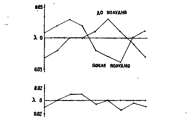 сумме второй колонки - 2/16 и т.д., это исправляет наклон числовой оси. Эти исправленные суммы в 16 колонках отсчетов делятся на 20 -число записанных оборотов, давая усредненное положение центральной черной интерференционной линии для каждого из 16 азимутов полного оборота прибора. Далее средняя ордината вычитается из ординаты каждой точки, и теперь эти точки, будучи нанесены на график, дадут кривую смещения полос, приписываемую определенному времени.