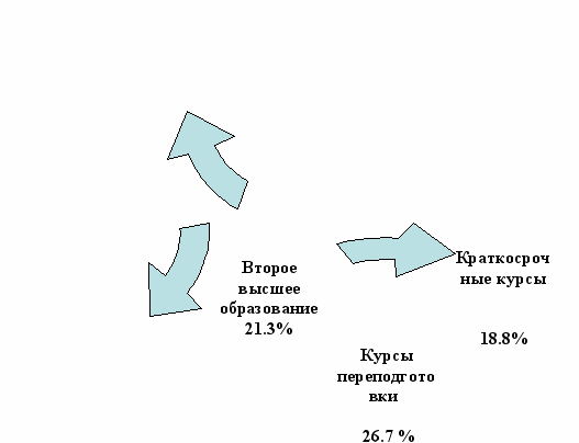 В качестве приоритетной формы переквалификации для молодых женщин сохраняется их ориентация на традиционные формы возможной смены профессии. Это: получение второго высшего образования, курсы переподготовки и краткосрочные курсы (рис3.).