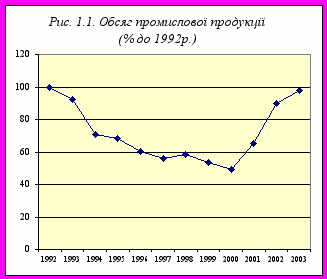 | Індекс обсягу промислової продукції у % до 1992 року | 100 | 100,0 | 76,7 | 74,4 | 65,5 | 60,8 | 63,3 | 58,3 | 53,3 | 65,2 | 89,8 | 98,1 |