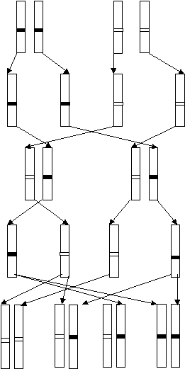 С открытием хромосом стало ясно, что дискретные факторы Менделя соответствуют хромосомам – альтернативные гены находятся в гомологичных хромосомах. Законы Менделя получили цитологическую основу (рис.13). В мейозе при образовании гамет – каждая гамета получает только одну из двух гомологичных хромосом своих родителей. При этом каждый член одной гомологичной пары входит в гамету в случайном сочетании с другим членом другой гомологичной пары хромосом. Это правило независимого распределения негомологичных хромосом.