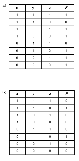 Анализируя таблицу истинности, замечаем, что количество нулей и единиц в результате (значения переменной F) одинаково, поэтому выбор конкретного способа построения может быть любым. Выберем дизъюнктивный многочлен.