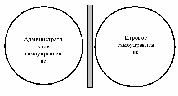 Примечание. В данной модели самоуправления эти два вида деятельности практически не пересекаются: самоуправление осуществляется в основном административным путем, в том числе с участием детей, а игровые формы используются эпизодически, детям "позволяют" играть в самоуправление, не доверяя им серьезных вопросов, как правило, ограничивая сферу их ответственности досугом, физкультурой и туризмом и т.д.