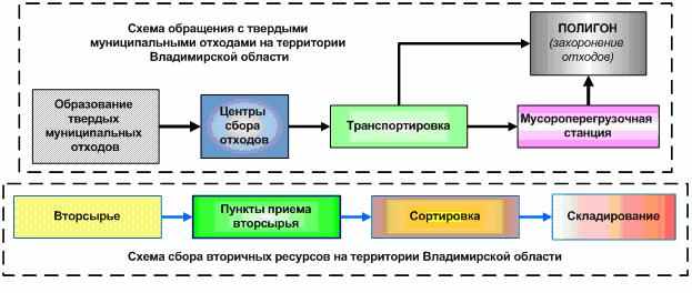 Существующая система обращения с ТМО на территории Владимирской области, сложилась еще 60-х годах. Эта система подразумевает лишь сбор, транспортировку и захоронение отходов, что недопустимо на современном этапе развития общества. В общем виде существующую систему обращения с ТМО в регионе можно представить следующим образом: