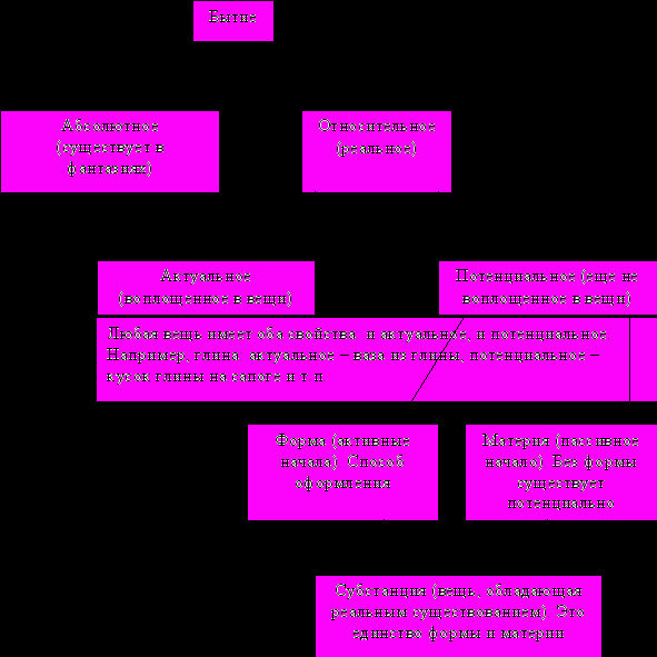 Если есть нечто сохраняющееся, то это есть бытие. Бытие против существования (Бог не существует, и он есть чисто бытие). Существование – нечто изменяющееся, а бытие – нечто постоянное. Что существует в реальности: бытие или существование? Бытие – есть реальность, существование – кажущаяся реальность. Платон: «Бытие есть мир идей, которые отражаются в вещах. Познание идет от общему к частному». Аристотель критикует эту концепцию, как искусственную. Идея, в его понимании, есть некоторая категория, просто слово.