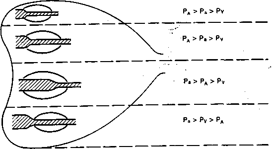 Однако взаимоотношения между ра, давлением в артериальном (Ра) и венозном (Pv) участках капилляра зависят от положения различных участков лёгкого по отношению к сердцу. Согласно Д.Вест (1988) и G.Y.Gibson (1984), при вертикальном положении тела в лёгких можно различать четыре зоны, определяемые гравитационным фактором (рис. 2.6). В верхней зоне (верхушки лёгких) среднее альвеолярное давление во время дыхательного цикла преобладает над артериальным, которое в свою очередь выше венозного: