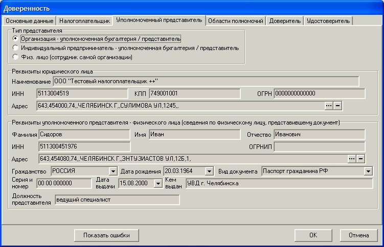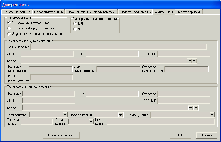 В случае, если доверенность выписал не налогоплательщик, а иное лицо (законный представитель или уполномоченный представитель), пользователь должен указать это лицо и разнести реквизиты этого лица в закладке.