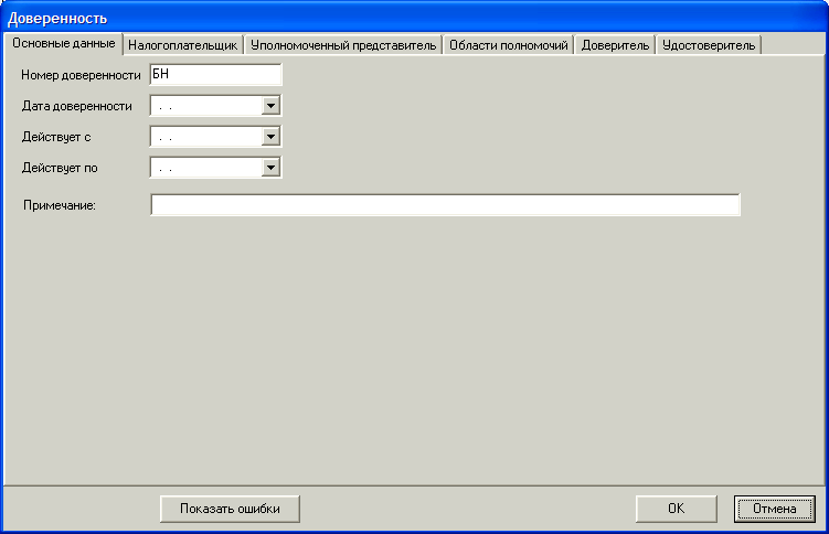 В закладке «Основные данные» пользователь должен заполнить «вручную» номер доверенности, дату доверенности, действует с и по. Если у доверенности нет номера, то нужно оставить значение БН, предлагаемое по умолчанию.