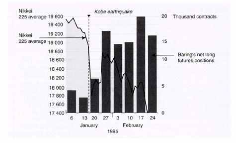 Руководство головного банка санкционировало его на проведение достаточно консервативных арбитражных операций, сводящихся к одновременной покупке call и put-опциона («стеллаж») с одинаковой ценой исполнения strike price. Арбитраж заключался в том, что трейдер покупал дешевый контракт и тут же закрывал позицию продажей более дорогого. Как известно, Put-опцион дает право держателю опциона продать определенное число акций по фиксированной цене за установленный период, напротив, Call-опцион дает право на покупку определенного числа акций по фиксированной цене за установленный период времени. Strike price — фиксированная в контракте цена за акцию, по которой владелец опциона может совершить сделку в случае исполнения опциона. Понятно, что такая стратегия имеет наибольшую эффективность в том случае, сели рынок колеблется около некоторого уровня, не испытывая резких движений «вниз» или «вверх», так как позиция по обеим сторонам (покупка-продажа) закрыта. В это время индекс Nikkei колебался на уровне около - 19000 – 19500, при этом strike price по большинству позиций Лисона по индексу Nikkei лежало в пределах 18500-20000. Ничто не предвещало каких-то особых проблем, однако 17 января в г. Кобэ в Японии произошло землетрясение. Это не могло не потянуть рынок «вниз» - для держателей put-опционов такая позиция становилась выгодной (так они могли продать свои акции по цене выше рынка), напротив банк в этой ситуации терпел убыток (рис.2.5).
