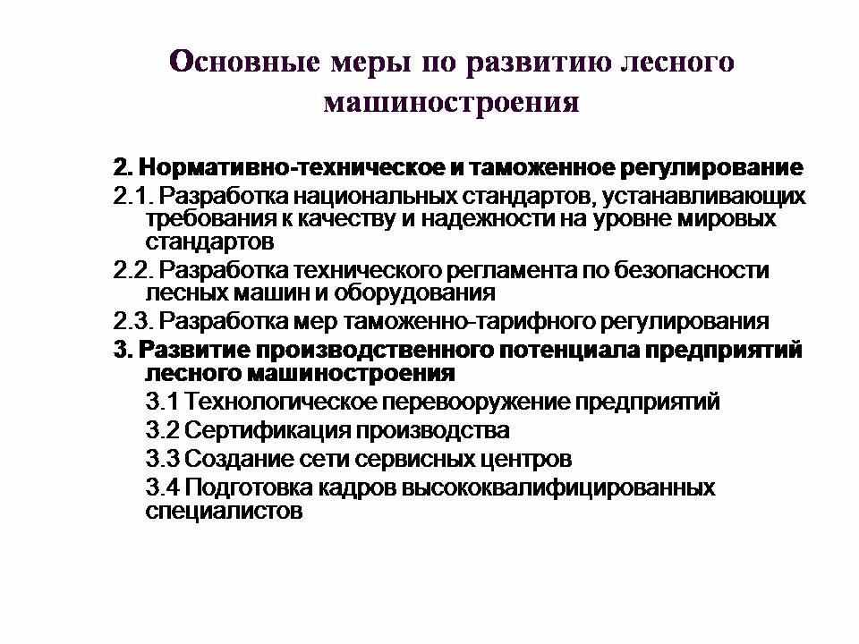 Следующим важным вопросом для лесного машиностроения является техническое регулирование на базе технических регламентов. Закон «О техническом регулировании» давал надежду на введение контроля за техническим состоянием парка машин по показателям безопасной эксплуатации. Его введение позволяло очистить парк от предельно изношенной техники, не обеспечивающей необходимые показатели безопасности, запретить использовать в лесу машины не предназначенные для работы в лесу и не имеющие специальных рабочих органов и средств защиты. Однако, изменение закона в 2007 году привело к прекращению работы над проектом специального регламента «О безопасности лесозаготовок». Чтобы такой важный механизм государственного регулирования отрасли, как технический регламент был введен в действие, необходимо сохранить место для лесной отрасли в новой правительственной программе разработки технических регламентов. Здесь необходимо активное участие нашего Комитета.