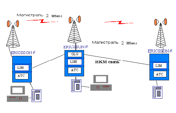 Рисунок 2 Принцип построения единой связи АТС с использованием радиорелейных каналовТехнология ISDN позволяет программно разделять телекоммуникационный ресурс. В одной сети может независимо существовать несколько самостоятельных систем. Связь между удаленными станциями организуется по цифровым трактам (общеканальной сигнализации № 7 (ОКС-7), (российский аналог - 2 Мбит/с ИКМ канал) со скоростью канала 2 Мбит/с. Связывать станции можно как по проводным, так и по радиорелейным каналам с максимальной дальностью (до 70 км.). Поскольку прокладывать собственные кабельные сети очень дорогое мероприятие, банку в данной ситуации выгодней использовать радиорелейную связь для объединения отделений. В практике имеются случаи, когда связь по радиорелейным станциям осуществляется на удалении до 130 км. и более, для этого необходимо выполнять главное условие - прямая видимость между антеннами. На рисунке 2 представлены различные способы объединения оборудования в сеть.