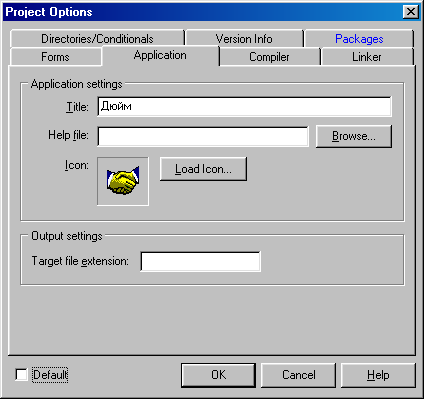 В поле Title следует ввести название приложения. Во время работы приложения его название выводится на панели задач Windows рядом со значком, изображающим приложение. Для выбора значка необходимо нажать кнопку Load Icon. В открывшемся диалоговом окне Application Icon следует просмотреть имеющиеся каталоги и найти файл подходящего значка (значки хранятся в файлах с расширением .ico). Выбрав нужный значок, нажмите Открыть. В результате диалоговое окно Application Icon закроется, и вновь появится диалоговое окно Project Options, в котором теперь отображается выбранный значок приложения. Для завершения процесса нажмите кнопку OK.