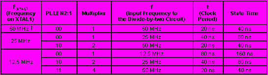 Для 80C196NU, Таблица 2-3 детализирует связи между входной частотой (F XTAL1), конфигурации PLLEN1 и PLLEN2, действующей частотой (f), периодом часов (t), и состоянием времени. Рисунок 2-6 иллюстрирует связь синхронизации между входной частотой (F XTAL1), действующей частота (f), и сигналом CLKOUT с каждой из трех имеющих силу конфигураций вывода PLLENx. (Так как максимум, действующий частота - 50 MHz, только 12.5 MHz внешняя частота часов позволяет все три режима часов.)