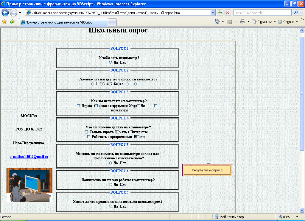 Выяснить существующее положение дел по использованию ПК помог школьный опрос. Разработанная анкета включает в себя 10 вопросов, которые характеризуют информационную компетентность, как самих учащихся, так и их членов семьи. Далее приведена анкета и её размещение на сайте.